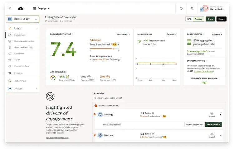 - Peakon (by Workday) - Best for enterprise-scale, continuous listening. Key strengths: real-time dashboards, AI insights. Enterprise pricing, Workday integration.